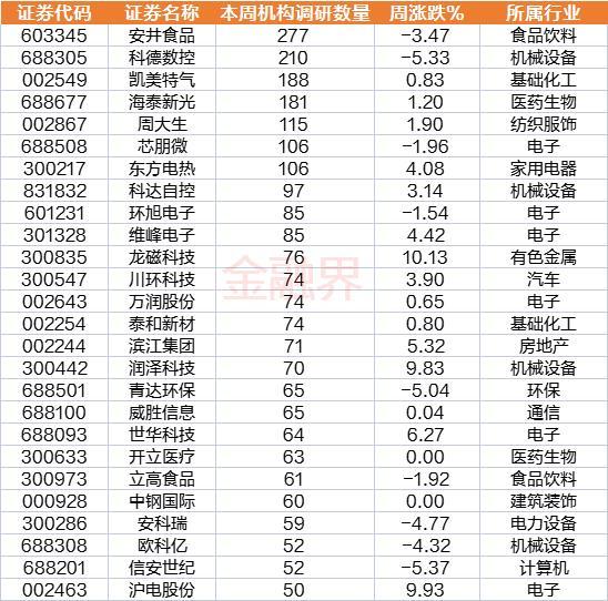 本周已披露相关调研信息的上市公司数量达到294家(前一周为223家),重点集中在机械设备、电子、医药生物、电力设备、基础化工等行业。其中26家公司获得超100家机构调研,安井食品成为机构“宠儿”,合计有277家机构调研了该公司,同时,科德数控也同样获得超200家机构扎堆;凯美特气、海泰新光、周大生、芯朋微、东方电热等受追捧。