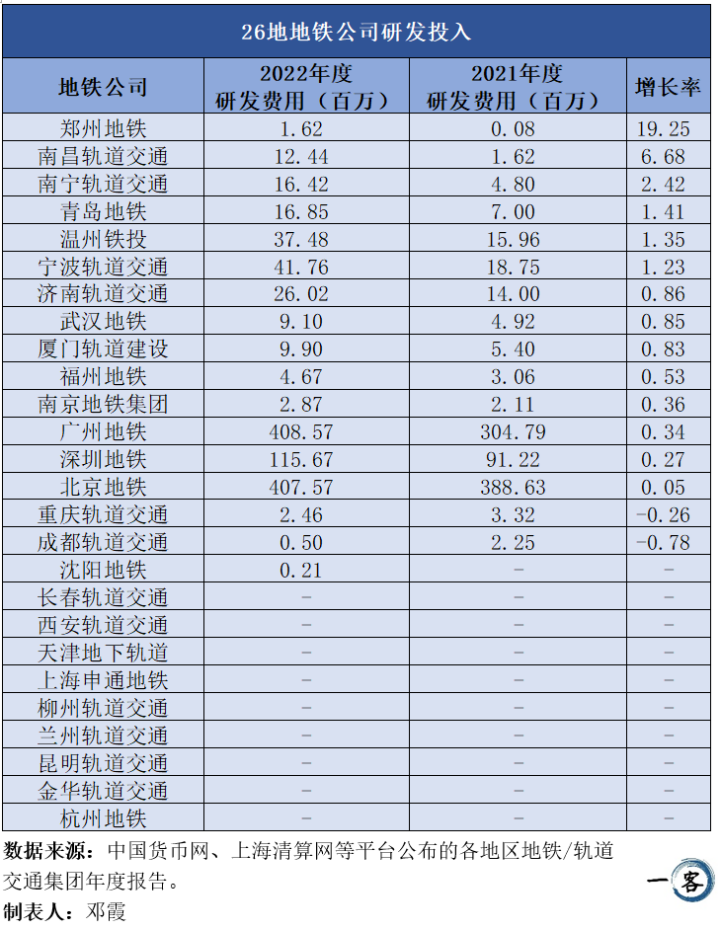年报数据显示,2022年,深圳地铁的研发费用达到1.16亿元,同比增长27%。武汉地铁研发费用910万元,同比增长85%。济南轨道交通研发费用为2602万元,增长了86%。