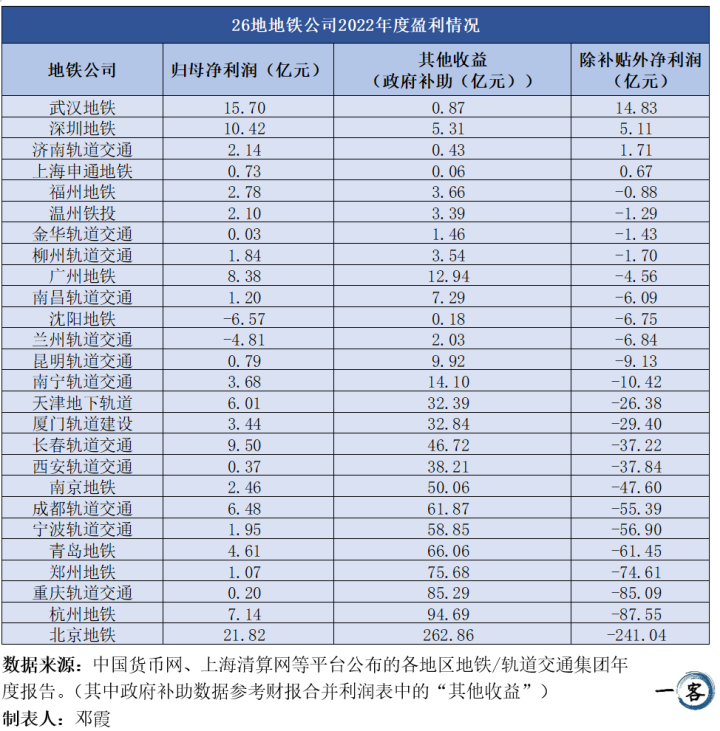 净利润排行前三的分别是北京(21.82亿元)、武汉(15.7亿元)、深圳(10.42亿元),但除去政府补助后,净利润为正的只有武汉(14.83亿元)、深圳(5.11亿元)、济南(1.71亿元)和上海(0.67亿元)。