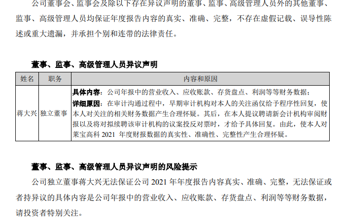不过,蒋大兴则对审计机构的回复并不满意。他表示,“在审计沟通过程中,早期审计机构对本人的关注函仅给予程序性回复,使本人对关注的相关财务数据产生合理怀疑。其后,在本人提议聘请新会计机构审阅财报以及将对拟续聘该审计机构的议案投反对票时,才给予具体回复。由此,使本人对莱宝高科2021年度财报数据的真实性、准确性、完整性产生合理怀疑”。