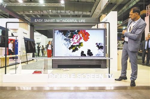 9月6日,在德国首都柏林举办的第59届柏林国际消费电子展上,一名参观者在长虹公司展区观看双屏电视。 新华社记者 单宇琦摄