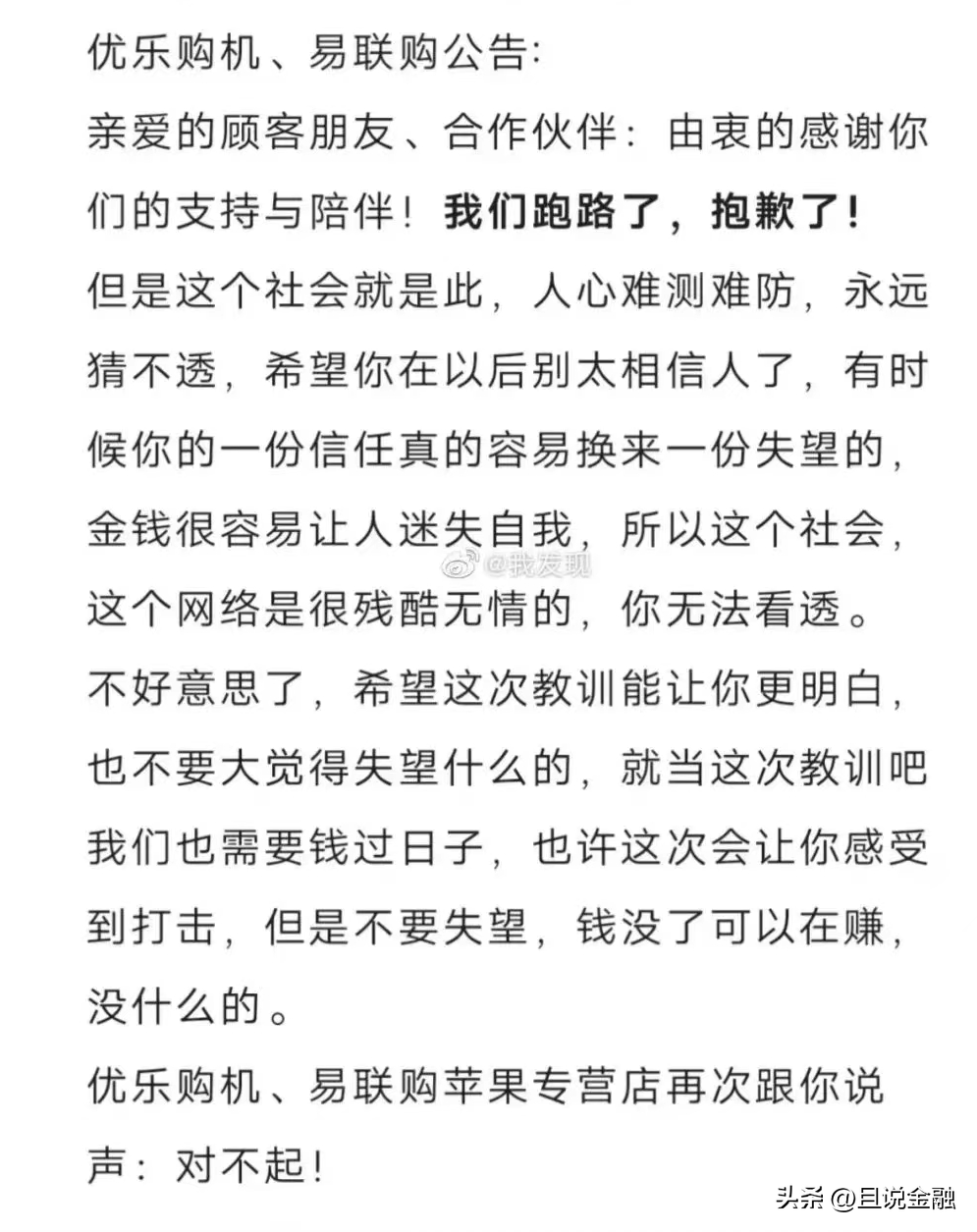 公告的内容通俗易懂:我们跑路了,钱都洗干净了、以后不要贪高息、不要瞎投资、我们不骗你也有别人骗你,这不就是杀人诛心?嚣张至极。