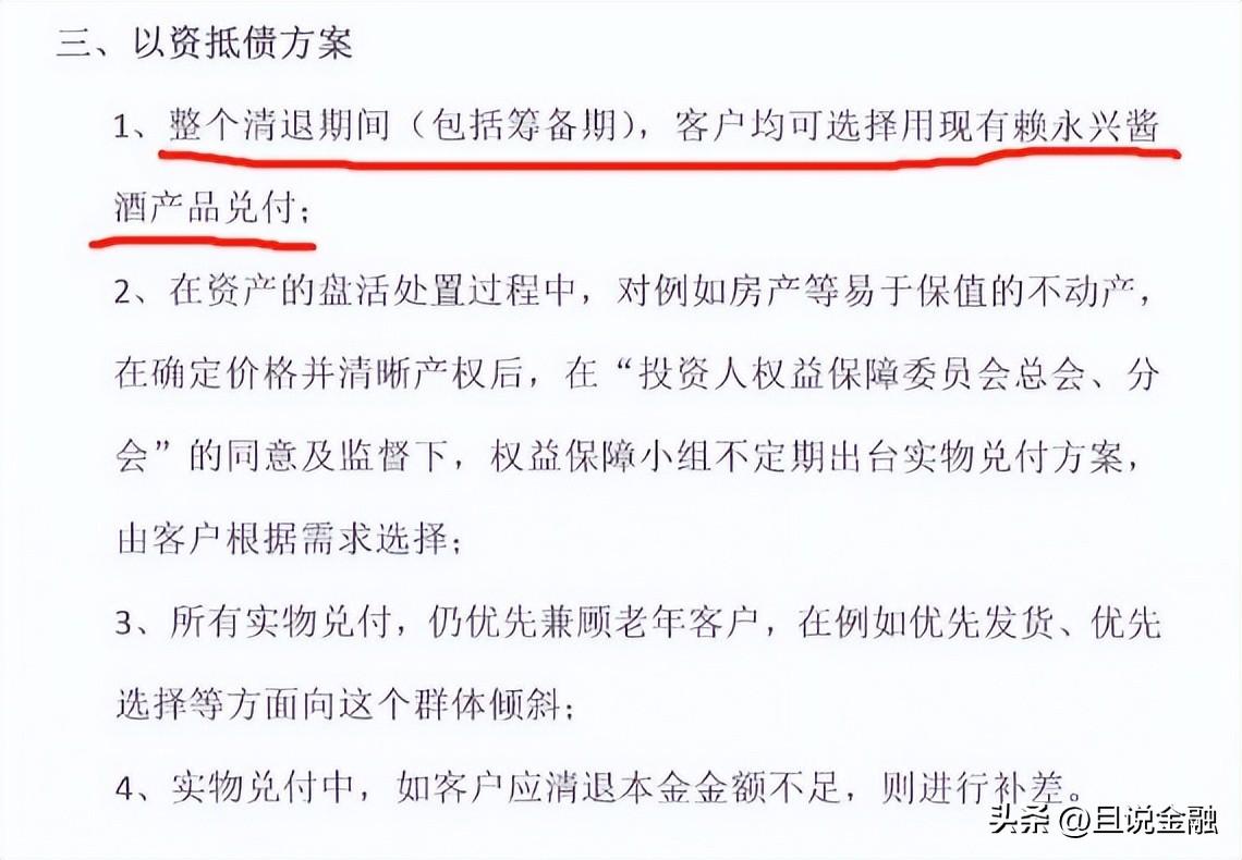 ,客户可选择用现有赖永兴酱酒产品兑付,以及对公司房产等易于保值的不动产,在确定价格并清晰产权后进行实物兑付。
