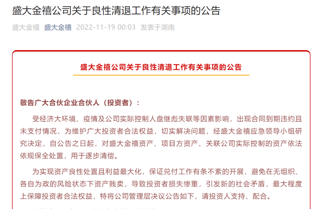 11月19日凌晨,风靡湖南的理财公司盛大金禧发布良性清退工作有关事项的公告。表示受大环境及疫情影响,公司出现合同到期无法支付的情况,为了维护投资者权益,盛大金禧领导组召开紧急会议表示,自公告日起,对盛大金禧资产、项目方资产、关联公司实际控制的资产依法依规保全处置,用于逐步清偿。
