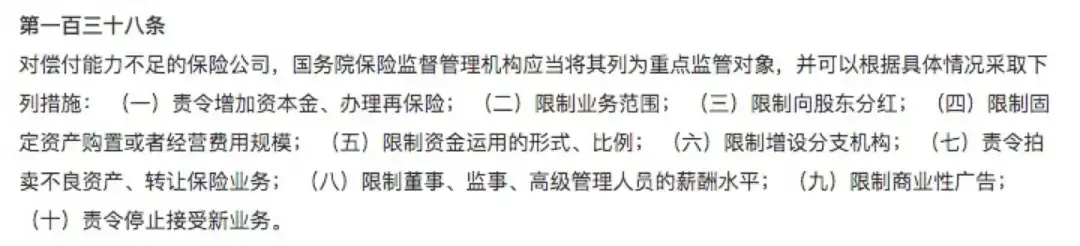 根据《保险法》第138条:对偿付能力不足的保险公司,国务院保险监督管理机构应当将其列为重点监管对象,可以根据具体情况采取下列措施: