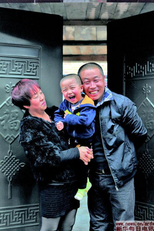 马爱威(右)和妻子宋瑞风及儿子在家门口合影(2017年10月17日摄)。
