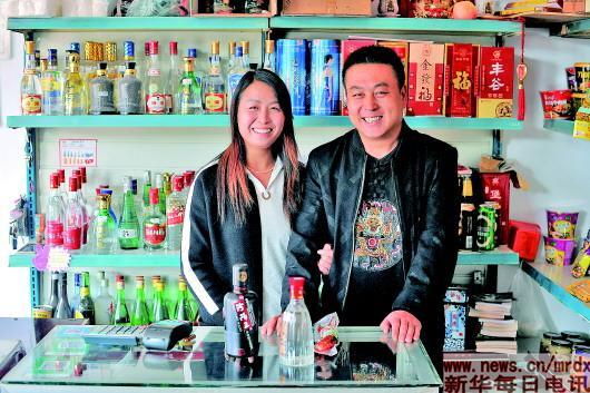 杜青春(右)和妻子韩丽英在小卖部里合影(2017年10月19日摄)。