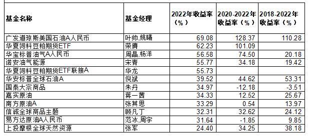 2022年,公募基金收益率排行榜出炉,据Wind统计,全市场的公募基金中,年度收益率最高的5只基金来自QDII基金和商品型基金,包括广发道琼斯美国石油A人民币、华夏饲料豆粕期货ETF等。