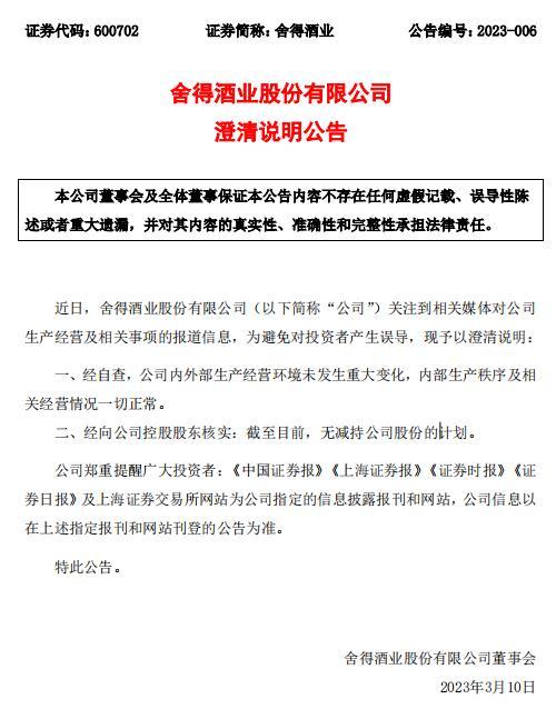 对此,为避免对投资者产生误导,舍得酒业9日晚间发布澄清公告。