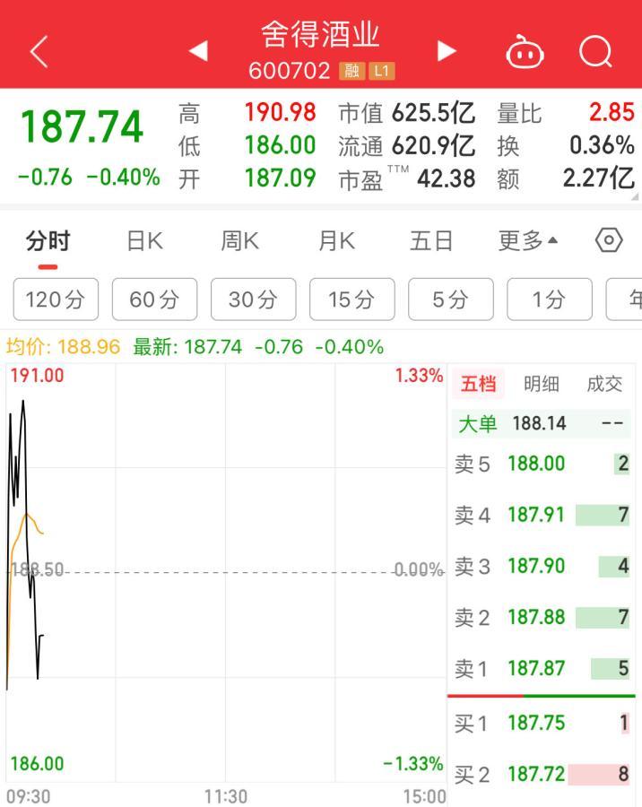 中新网3月10日电 3月9日,舍得酒业盘中股价突然闪崩,逼近跌停,随后快速收回,收跌4.32%,报收188.5元。