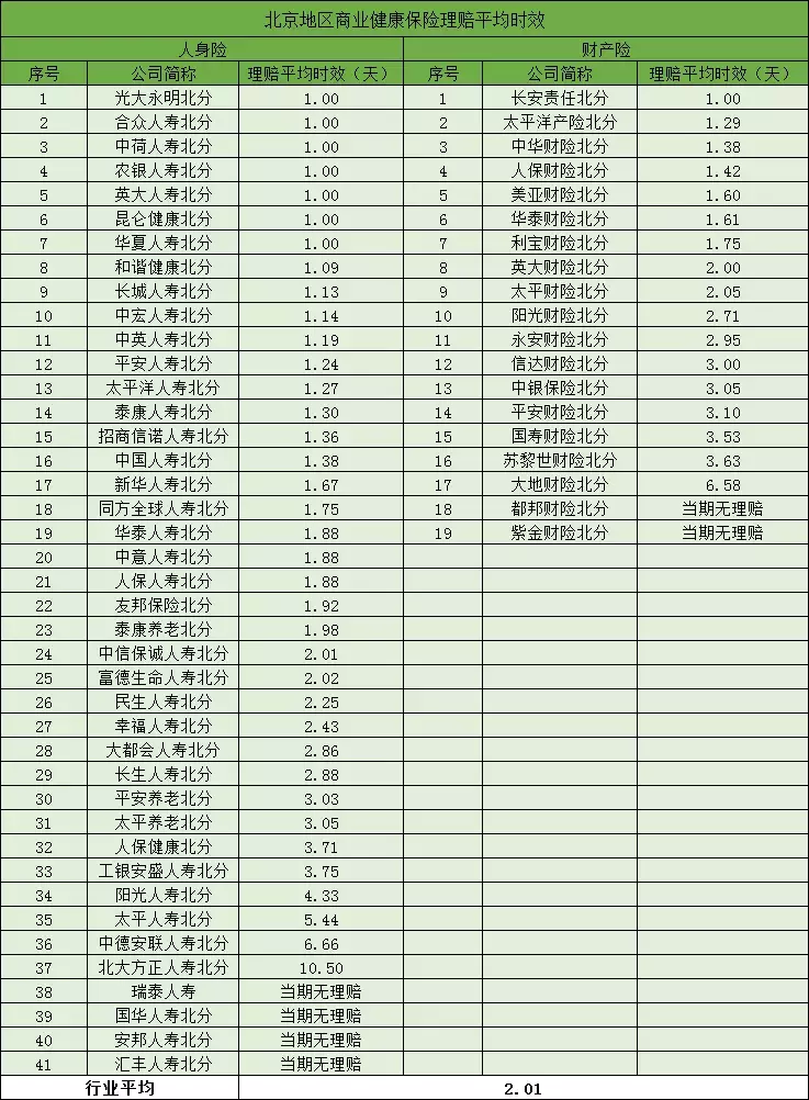 该表格一共统计了41家寿险公司和19家财产险公司,行业平均时效为2.01。细心的朋友就会发现排前10名的都是平时比较少出现在公众视野的公司,反而平时我们认识的那几家大公司稍逊色一些,虽然差别不大,但也足以说明“小公司”们的理赔时效并不比那些大公司差。