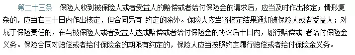 《保险法》二十三条:要求保险公司及时作出核定;情形复杂的也要三十天内作出核定,然后对赔偿责任在十天内做出赔偿或者达成协议。