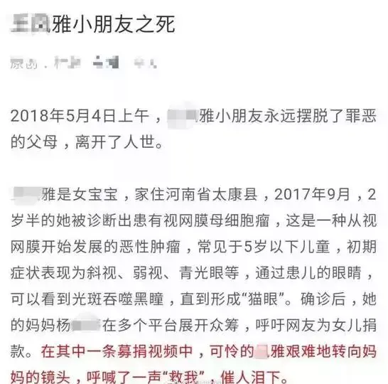 2017年11月,两岁半的王凤雅被太康县人民医院和郑州大学第一附属医院先后诊断为双侧视网膜母细胞瘤。此后,杨美芹通过水滴筹、火山小视频向社会募捐,并且从三月份开始接触志愿者和公益人士。让杨美芹没有想到的是,原本以为向外求助会给女儿带来治病的希望,却一不小心将整个家庭拖进了漩涡。