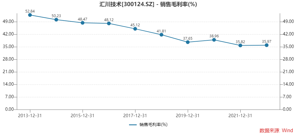 十年前,汇川技术销售毛利率在50%之上,如今已跌至35%附近。