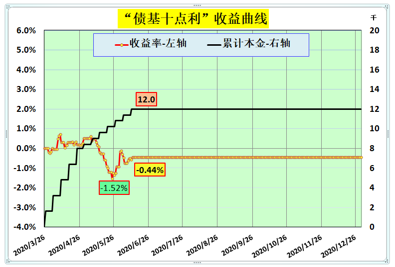 截至6月12日,累计投入12k,已超出原定预算20%,持有收益为-0.44%。