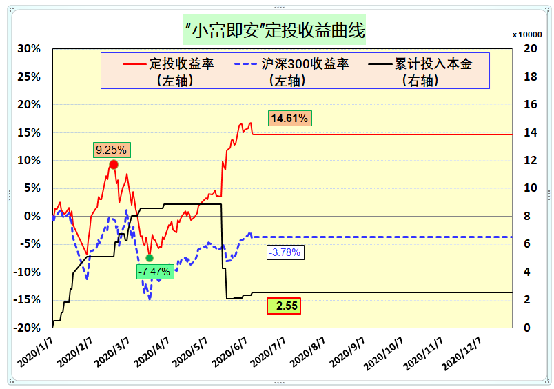 截止6月12日,小富即安定投累计投入本金2.55万元,持仓收益为14.61%,而同期沪深300指数下跌3.78%。