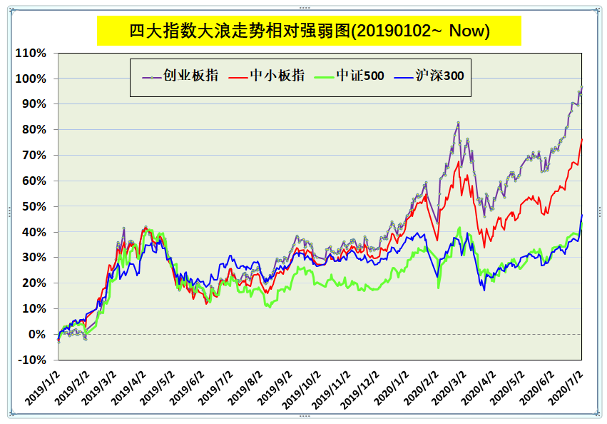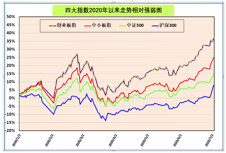四大指数自2020年以来涨跌走势相对强弱图如下。