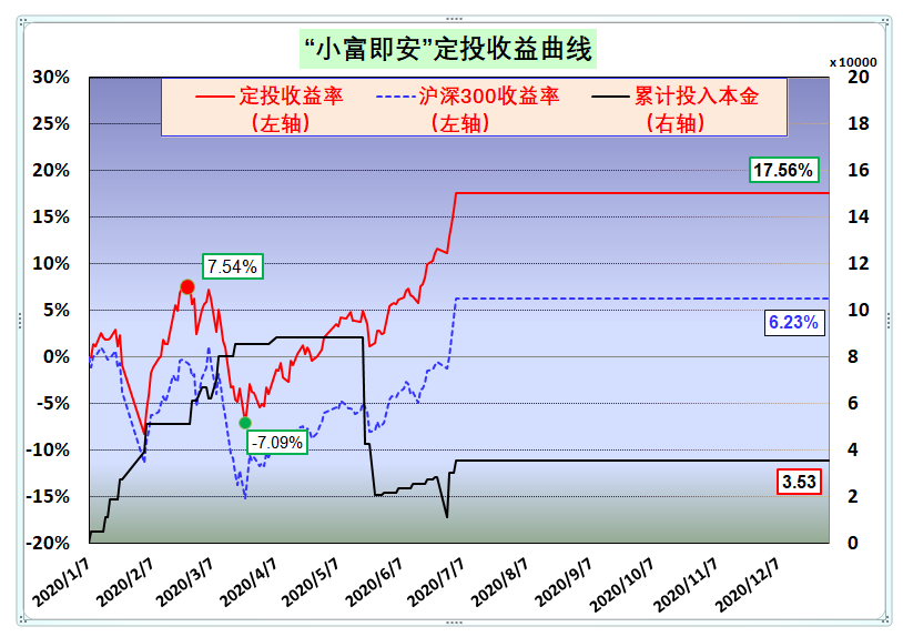 截止7月3日,小富即安定投累计投入本金3.53万元,投资收益为17.56%,而同期沪深300指数上涨6.23%(基准日2020年1月7日)。