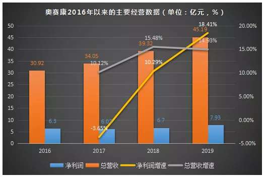 2020年2月26日,奥赛康公布2019年度业绩快报,实现营业收入45.19亿元,同比增长14.93%;实现利润总额9.10亿元,同比增长20.60%;实现归母净利润7.93亿元,同比增长18.41%。整体来看,业绩保持着平稳上升的态势。公告显示,业绩增长的原因来源于抗消化道溃疡和抗肿瘤领域的平稳增长。