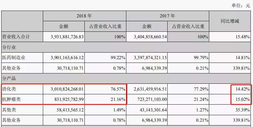 从产品结构来看,奥赛康的消化类和抗肿瘤类产品是公司的主要收入来源。目前产品剂型主要定位于冻干粉针制剂、固体口服制剂,在国内抗消化性溃疡药物质子泵抑制剂注射剂产品细分领域市场占有率第一。以2018年为例,消化类实现销售收入30.1亿,占总营收比重为76.57%;抗肿瘤类实现收入8.32亿,占比21.16%。