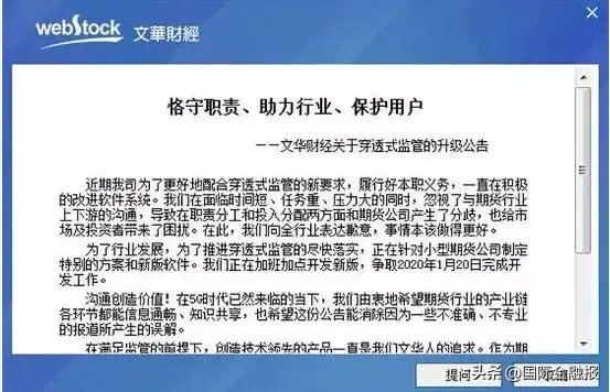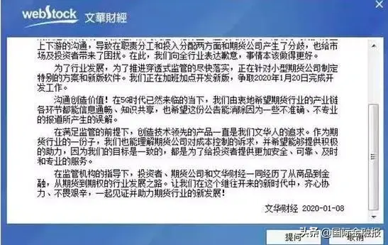 1月6日,用户登陆文华财经软件时发现一则公告,称“近期市场上流传‘文华财经交易软件存在不符合监管要求的情况及可能停用’系谣言,是因为有的小期货公司不想投入,拒绝升级而已。仅仅个别不想升级的小期货公司客户,会受到影响”。