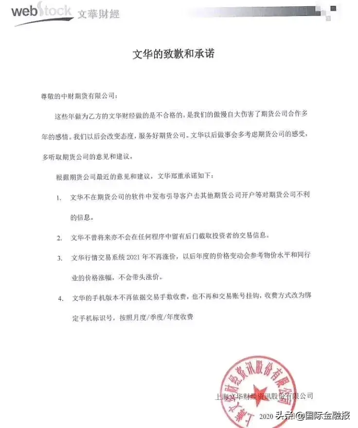 经历了全行业封杀后,文华财经不得不低下“高昂的头颅”。1月16日晚间,文华财经向多家期货公司发出致歉信称,自身“作为乙方是不合格的”,是自己的傲慢自大伤害了与期货公司合作多年的感情,今后会改变态度,服务好期货公司,会多考虑期货公司的感受,多听取期货公司的意见和建议。