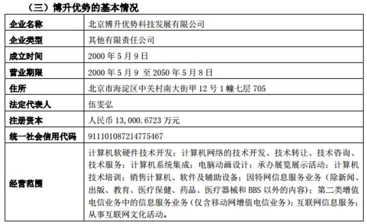 公告显示,博升优势注册资本1.3亿元,注册地位于北京市海淀区,法定代表人伍雯弘正是吴鹰的几个铁杆老部下之一。此外,天眼查显示,北京中泽启天投资中心是博升优势诸多股东中持有股份最多的。