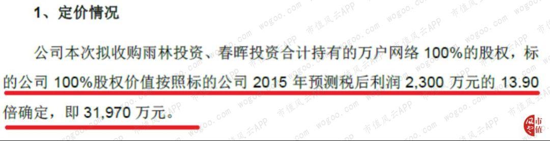 华宇软件是在2015年以3.2亿的现金收购万户网络100%股权。其估值用收益法确定,为2015年预测税后利润的13.90倍。