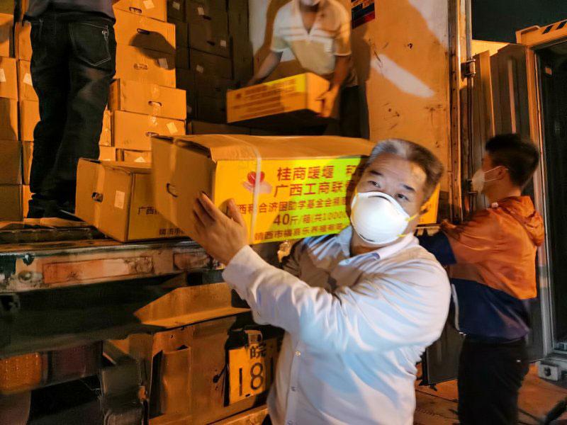 图:在自治区工商联主席视频扩大会议上,当得知区工商联将筹集一班广西工商联系统民企驰援十堰物资专列时,黄定寿马上主动提出支援十堰猪肉等生活食品的请求,在极短的时间内,安排屠宰加工10万斤健康生态猪肉,在发车前一天的深夜通过冷藏车送到火车站台,并连夜组织搬运工装车,还亲自上阵搬运猪肉。